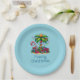 Paper plates with a seasonal holiday image. A tropical palm tree decorated in festive lights with a star on top. A giant red and white candy cane sticking out of the sand. Christmas presents under the tree. Whimsical and fun.