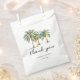 Summer destination wedding favour bags featuring tropical watercolor palm trees, the title 'thank you', the bride/groom names, and your wedding date.