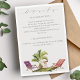 This tropical palm tree wedding details enclosure card is a tropical jungle design with the colours of nature. It features palm trees, luscious rainforests, and bungalows nestled within a beautiful tropical paradise setting.