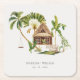This tropical wedding paper coaster is a tropical jungle design with the colours of nature. It features palm trees, luscious rainforests, and bungalows nestled within a beautiful tropical paradise setting.