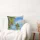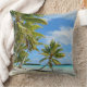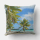 Throw pillow with a hanging palm tree on a white sand beach of a tropical island in the Pacific Ocean belonging to the Tahiti archipelago French Polynesia.