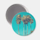 Event magnet with a beautiful photograph. Tall palm trees with long skinny trunks in front of a lovely green sky. Retro colour scheme. Relaxing and chill.