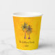 Tropical Bright Gold summer swim party paper cups, with a palm trees illustration design and customisable lettering. A great addition your picnic pool party with a beach theme.