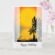 Open window and sheer curtains view of palm trees silhouetted on tropical sunset with ocean water for birthday.