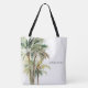 This tote bag design features a group of beautiful tropical lush green and brown watercolor palm trees on a simple, clean white background. Perfect for a beach lover. Personalise it with a first name or initial. Created by Simply Farmhouse Press.