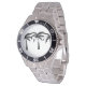 Has heft and feel of expensive stainless steel quartz watches. Good band with safety catch. I removed links, which is easy because engraved arrows show direction to push the linking pins. As always by this seller, the image (a railroad logo) is a perfect reproduction of my emailed image, and is precisely spaced and aligned.
