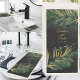 An elegant watercolor painted tropical wedding invitation featuring a dramatic black watercolor wash backdrop with exquisitely painted green palm leaves and shimmering gold accents. A lively gold swash script calligraphy announces your wedding details.