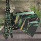 An elegant watercolor painted tropical wedding invitation featuring a dramatic black watercolor wash backdrop with exquisitely painted green palm leaves and shimmering gold accents. A lively gold swash script calligraphy announces your wedding details.
