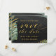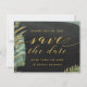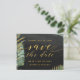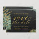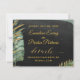 An elegant watercolor painted tropical wedding invitation featuring a dramatic black watercolor wash backdrop with exquisitely painted green palm leaves and shimmering gold accents. A lively gold swash script calligraphy announces your wedding details.