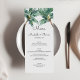 Modern tropical wedding menu features watercolor palm trees with with your names, wedding date and menu options in charcoal grey lettering. Reverse side is a sage blue/green painted background. Perfect for tropical destination, beach, seaside, Hawaiian island and summer themed weddings. Original artwork KL Stock