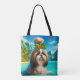 Escape to paradise with this vibrant canvas tote featuring Magnum the Shih Tzu in a stunning tropical setting. With lush green mountains, swaying palm trees, and crystal-clear waters as the backdrop, Magnum shines in his island-inspired topknot adorned with vibrant leaves and a bright orange flower.