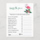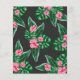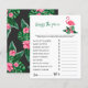 Baby shower invitation design features pink flamingo with lush green palm leaf fronds and tropical hibiscus flowers. "Aloha Baby". A tropical floral pattern with black background colour dresses up the back of the card.