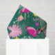 Super funny tropical pickleball party with pink flamingos, drinks and tropical foliage.