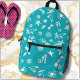 Aqua blue backpack with tropical images pattern. Personalise with her first name initial on the zipper pocket. The monotone, off-white pattern, which covers the bag, is made up of palm trees, sea stars, seashells, sunglasses, and more. The initial template is also off-white and is printed over a darker blue oval shape.