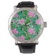 Vector seamless floral pattern with tropical decor: big pink flowers on background of palm leaves silhouettes, bushes, branches and jungle foliage © and ® Bigstock® - All Rights Reserved.