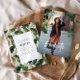 Painted tropical photo graduation announcement/invitation card. Hand painted script text.