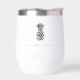 These elegant minimalist wine tumblers make great bridal party gifts or destination wedding favours for your summer or tropical wedding. Clean minimal design features your n names, wedding date, and location in classic black serif lettering. A pineapple illustration in black completes the design.