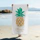 Tropical Pineapple Custom Name Beach Towel features a stencil styled yellow and green pineapple over a light yellow background. Personalise it with your first and last name in a stylish script font.