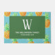 This pretty tropical pineapples patterned doormat bright blue edge with a green and white family monogram.