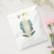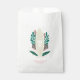 Surfs up! Tropical surf themed baby shower thank you favour bag with a natural wood grain surfboard and tropical leaves in shades of pink and green.