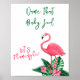 Baby shower invitation design features pink flamingo with lush green palm leaf fronds and tropical hibiscus flowers. "Aloha Baby". A tropical floral pattern with black background color dresses up the back of the card.