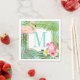 Personalised napkins feature a custom monogram initial / letter framed by a pretty pink flamingo and lush tropical palm leaves and hibiscus flowers. Vibrant colours include pink, magenta, yellow, green, seafoam, and aqua blue.