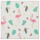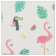 A modern tropical pattern featuring a lovely pink cartoon flamingo, a colourful toucan, watermelon and lemon slices and green leaves.