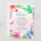 Modern ocean beach aloha Hawaiian style bridal shower party invitation template featuring a colourful hibiscus flowers wreath with tropical leaves, a starfish, a pink flamingo bird over a watercolor wash blush pink background. ++++++++++ The invitation is suitable for summer aloha, seaside, ocean, beach, destination seasonal by the sea wedding bridal parties.