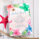 Modern ocean beach destination Hawaiian style bridal shower party invitation template featuring a colourful hibiscus flowers wreath with tropical leaves, a starfish, a pink flamingo bird and blue script over a watercolor wash blush pink background. ++++++++++ The invitation is suitable for summer aloha, seaside, ocean, beach, destination seasonal by the sea wedding bridal parties.