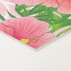 Colourful design features tropical pink hibiscus flowers, ferns and tropical leaves on light pink and white geometric pattern background.