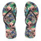 Black flip flops with a pattern of green, peach, cream and blue tropical plants, these are perfect to dress up your outfit for any occasion.