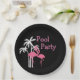 Stylish and trendy beach theme tropical pool party paper plates designed with cute pink flamingos and Palm trees with the words pool party you can customise online for your summer social gathering with friends and family.