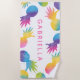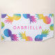 Make a splash with this playful tropical beach towel showcasing watercolor pineapples in rainbow tie-dye hues on a clean white background. A large pink personalised name adds a fun custom touch perfect for the beach or poolside. All text is fully editable to feature any name you choose. A cheerful and colourful gift idea for summer birthdays, vacations, and pool parties.
