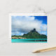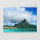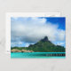 Postcard of an overwater resort in the fantastic turquoise lagoon of Bora Bora with Mt. Otemanu in the background in French Polynesia near Tahiti with a fading bar and the text: 'Bora Bora'.