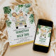 Safari themed birthday invitation featuring tropical green and gold watercolor greenery and a group of cute jungle animals