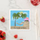 Cute tropical sandman wearing sunglasses and pink sun hat in beach sand with hammock and palm trees.