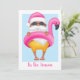 Santa in a hot pink stocking cap, yellow bathing suit and flip flops is in a hot pink flamingo inner tube on these tropical holiday greeting cards. Your greeting on the front and your names and message on the back. Select Matte for heaviest paper and high definition for best print quality.