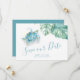 Announce your engagement with my 5x7 tropical save the date invitations with plain white envelope featuring trendy script typography script typography and my original watercolor monstera greenery and tropical sea turtle in shades of blue, turquoise and green. Space is provided for your names, wedding date and wedding location. Cards reverse to complimentary solid turquoise colour. Perfect for tropical Caribbean, Hawaiian, beach and destination weddings. To see the matching cute wedding invitations by Victoria Grigaliunas visit DoTellABelle on Zazzle.