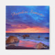 Beautiful tropical sunset with hues of pink and orange colours in a dark blue cloudy sky. Large rocks sits on the wet sandy beach with reflections of the sunlight on the sea water.