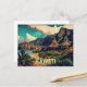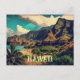 A Hawaii postcard of a tropical beach cove with towering mountains and a secluded beach with palm trees. This art postcard is part of a series of postcards created in a post impressionism art style and inspired by different locations around the world and does not necessarily depict an actual location