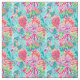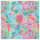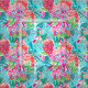 A seamless preppy pattern featuring pink, orange, coral, and red flowers on a minty green background, adorned with round paint splashes and white dots. The design has a hand-painted look, combining vibrant floral elements with whimsical splashes to create a lively and stylish effect.