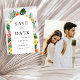An elegant wedding save the date in tropical summer theme featuring hand painted watercolor palm leaves, banana leaves, hibiscus, plumeria, and a lovely photo of the couple at the back.