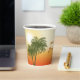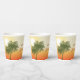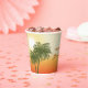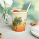 Serve drinks in tropical style featuring Destei's vibrant design on paper cups. Green palm tree silhouettes stand against a glowing orange-to-yellow sunset sky, with three birds flying in the sky. Add a personal touch with your own text to make every sip feel special.