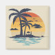 Retro style tropical summer sunset scene illustration with palm trees, clouds, birds and sea decoration