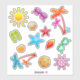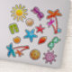 Summertime scrapbook stickers.  Each sticker is shaped like the object and includes a sun, palm trees, starfish / sea stars, seashells, flip flops, a ship’s wheel, and sunglasses.  Bright and colourful designs are perfect for creating a scrapbook page for a summer birthday or pool party.  Shaped stickers are also fun to give party goers as favours, or use to decorate envelopes and packaging.  Sticker sizes will correlate to the sheet size ordered.
