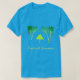 Mosaic, graphic drawing, of an island, with coconut trees, and hut, displayed with phrase, "Tropical Summer"-in multicolored, shades of green,yellow, brown, and blue.