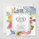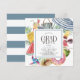 This cute grad/graduation party invitation features a white background with a beach umbrella, flip flops, tropical mason-jar drink/cocktail, popsicle, watermelon, doughnut, pineapple, straw hat, fresh coconut drink, pinwheel and sunglasses. The reverse side features a white background with blue stripes. Perfect for a summer graduation party on the beach or at the pool side! Personalise it for your needs. You can find more matching products at my store.