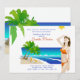 A bright and colourful invitation that's perfect for your beach theme bachelorette weekend. These charming invitations feature a tropical beach and a woman, wearing a bikini, looking up at the sun. The back is just a pretty as the front.
