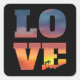 A tropical beach is the perfect setting for love! Beautiful knockout text effect stickers with stacked letters of the word LOVE. A colourful tropical sunset scene with palm trees in silhouette shows through the block letters on black background.