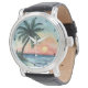 This artistic wall clock features a beautiful illustration of a palm tree silhouetted against a vibrant tropical sunset. The design captures a serene ocean with gentle waves under a colourful sky, evoking a relaxing summer beach landscape. This stylish and artistic timepiece is perfect for interior decor, bringing a calm and vibrant tropical theme to any room.